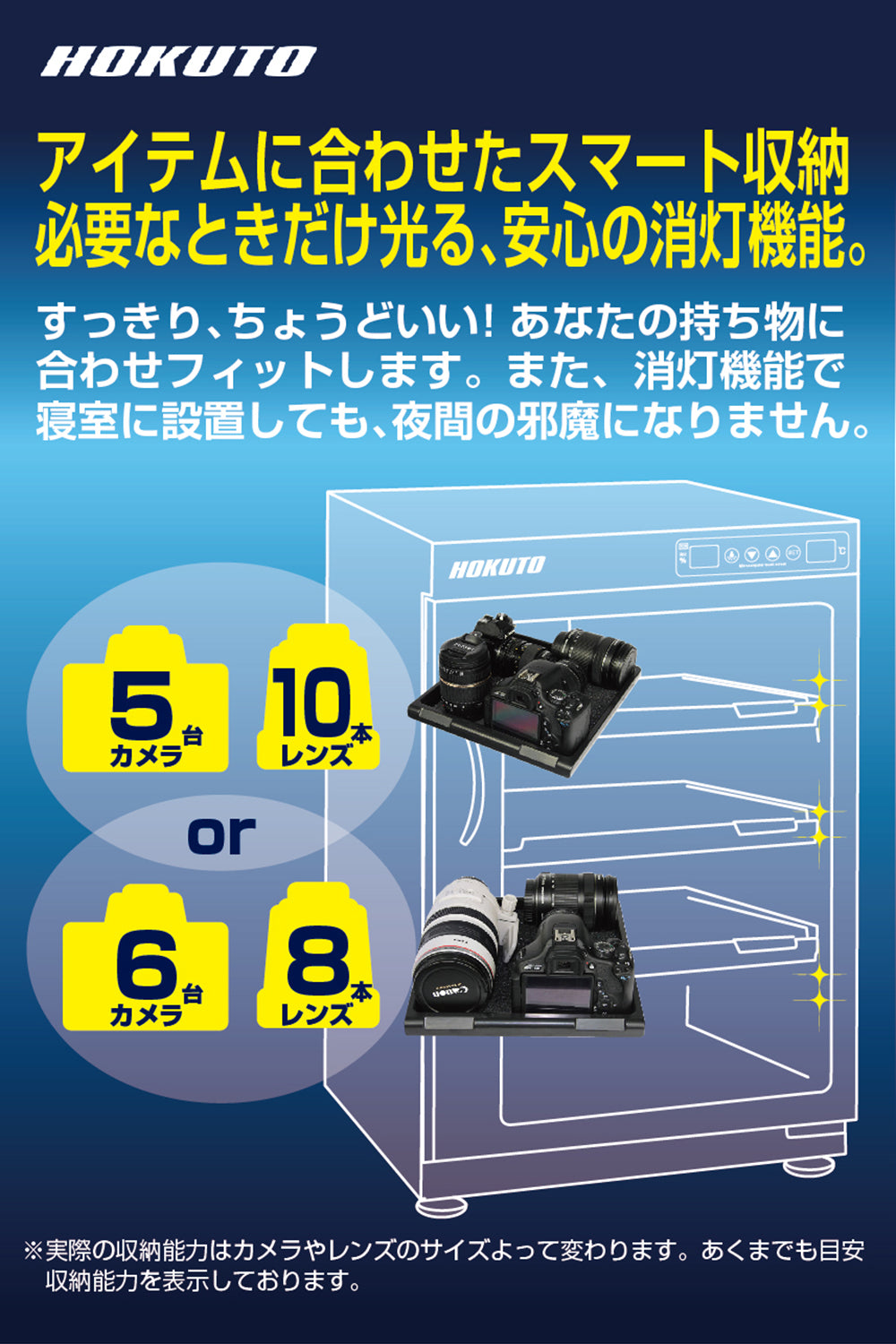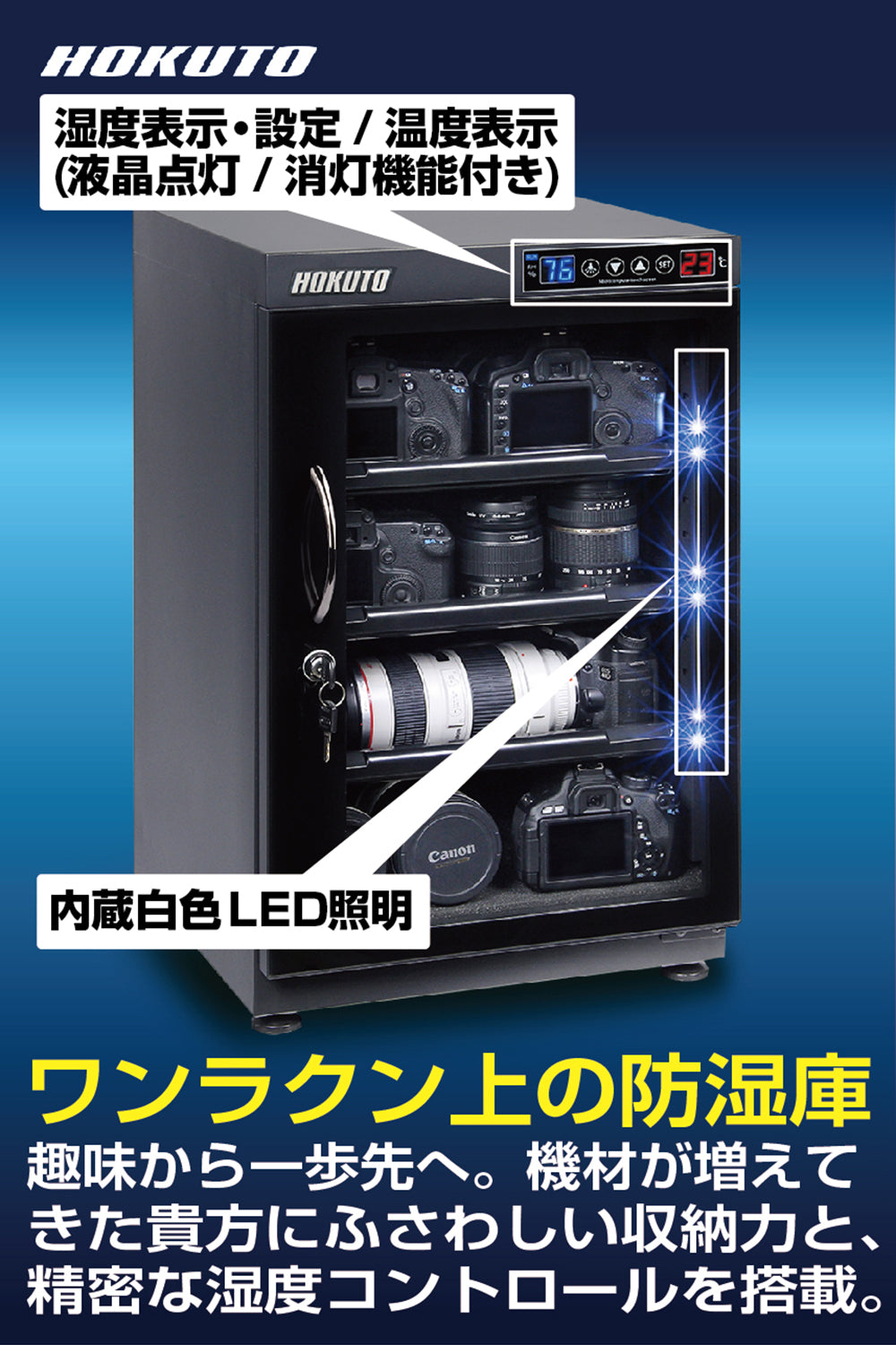 カメラを守るならHOKUTO防湿庫! 高性能な湿度管理で、あなたの大切な機材を長期間保護します。
